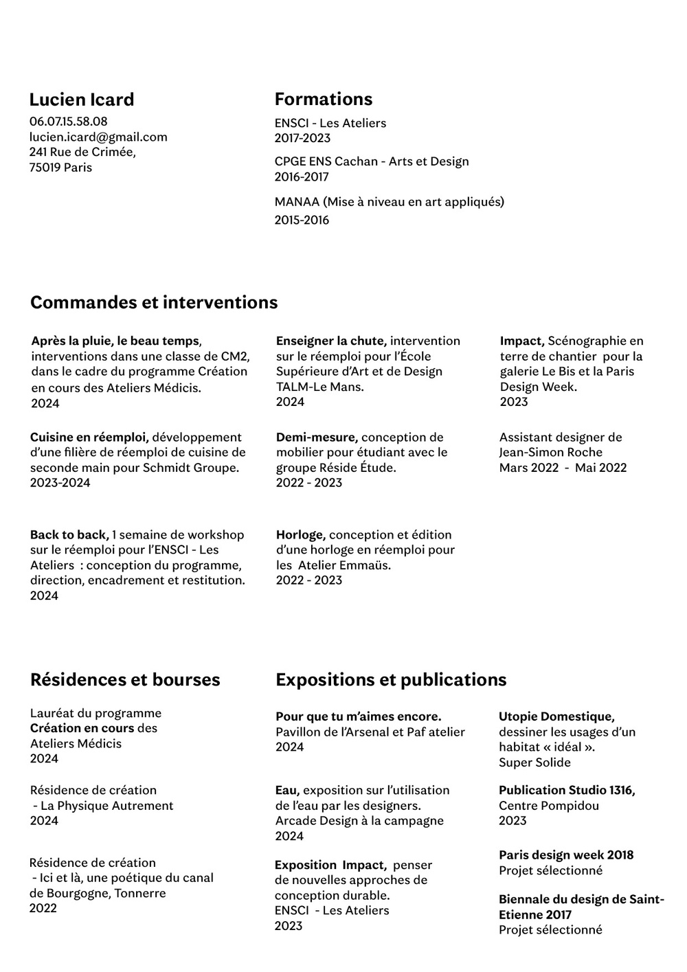 Je suis Lucien Icard, designer indépendant, formé à l’ENSCI – Les Ateliers. Mon travail questionne nos manières de produire, de consommer et d’habiter.