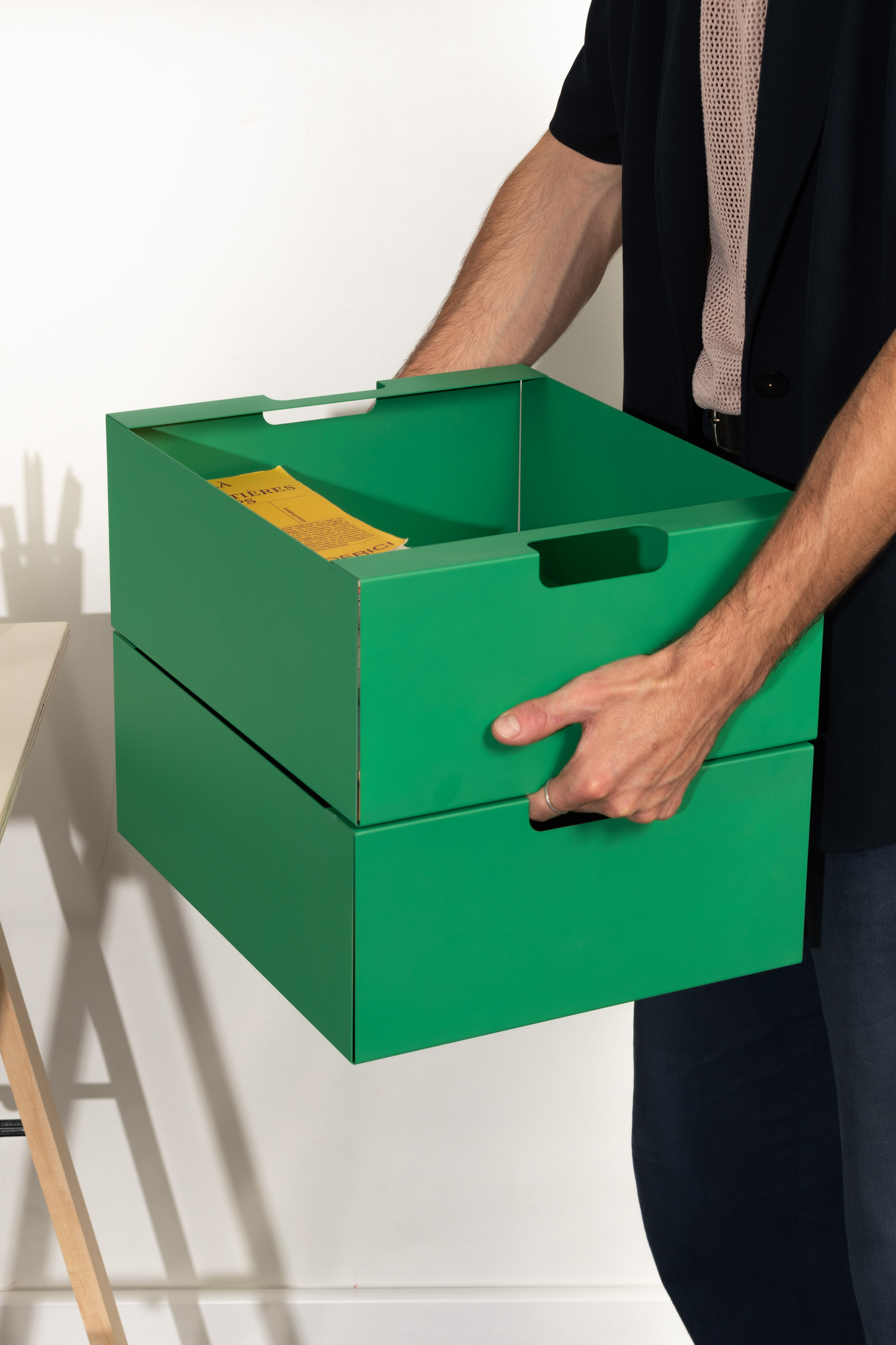 L’ensemble de la gamme d’objet s’articule sur une caisse de rangement en tôle pliée pour répondre au besoin prioritaire de rangement dans un petit logement.