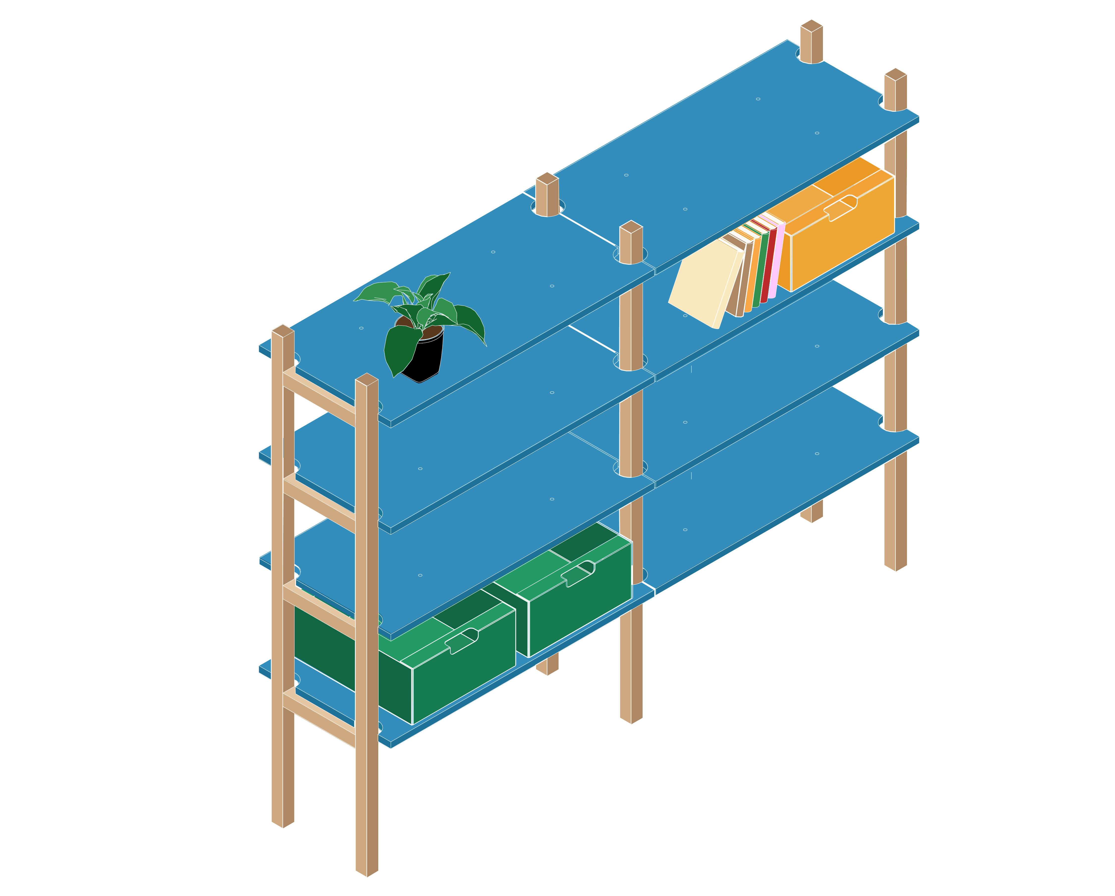 Pour s’adapter à chaque espace les étagères sont dessinées pour s’assembler dans leurs longueurs à la demande. Répondant ainsi aux contraintes de chaque appartement, mais aussi aux espaces collectifs.